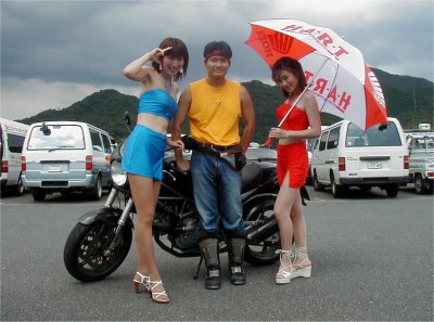 ・mini Moto−GP(4stミニバイク)1時間耐久レース ・ミニバイク3時間耐久レース ・ナンバー付車両OK 2時間耐久レース ・走行会 、、などなど盛り沢山で、あの暑さの中、参加者もビジターもスタッフもバテバテで した。 皆さん無事に、と言いたいところですが、ST600で参加のF君が周回遅れの 車両と接触、転倒となりました。幸い怪我はたいした事はないのですが、バイクが、、 かなりの、、、(;;)、、。 暗い話題はこのくらいにして、脳天気な話題を。 今回、ビジターでこられたM君の嬉しそうな表情をごらん下さい。 ご存じレイステックのキャンギャルEmikoさん(青)と、Lumiちゃん(赤) に挟まれてお気に入りS4と共に記念撮影の図です。Emikoさんは今年8耐オンステージにも出演する予定ですので、画面や雑誌にも露出することが多いと思います。とってもイイ子ですので、みんなで応援してね。 ![]() |